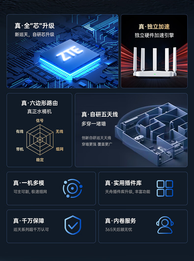 中兴(ZTE) 巡天AX3000Pro+路由器 5G双频超千兆双2.5G Mesh无线路由器 WIFI6 电竞路由穿墙大覆盖